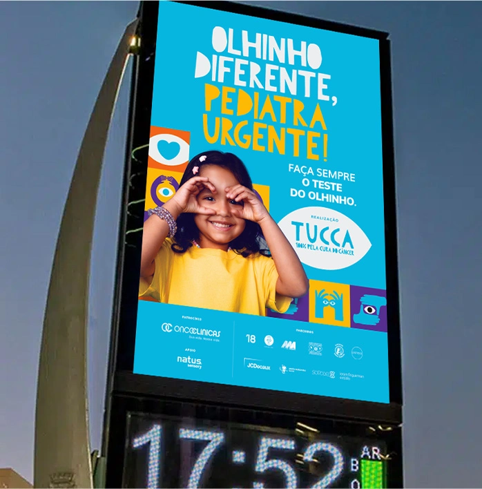 A campanha “Olhinho Diferente, Pediatra Urgente!” da TUCCA, deu visibilidade ao retinoblastoma, câncer infantil raro e agressivo. Com um jingle marcante, identidade visual atrativa, conteúdos digitais e materiais educativos, mobilizou parceiros e ganhou destaque na iluminação do Cristo Redentor. Uma ação integrada que transformou informação em prevenção, reforçando a importância do diagnóstico precoce, capaz de garantir até 100% de cura.
